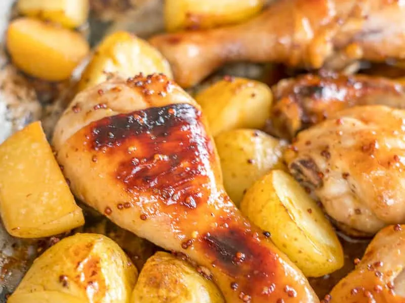 Sheet pan roasted chicken drumsticks and potatoes glazed with a tangy-sweet honey soy mustard sauce. Unpeeled potatoes roast alongside the chicken, absorbing the savory-sweet pan juices. A simple weeknight dinner that requires minimal prep and comes together in one tray with a sticky, caramelized finish.