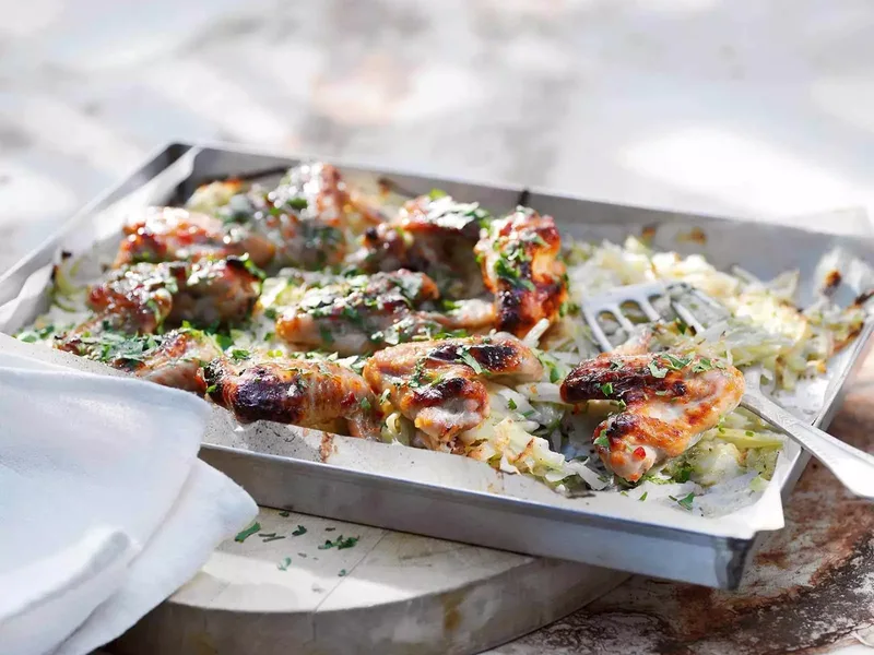 Shredded waxy potatoes and kohlrabi form a golden rösti base, topped with chicken wings coated in sweet chili sauce. Roasted until the wings caramelize and the vegetables crisp at the edges, finished with fresh cilantro. A one-pan sheet dinner combining textured vegetables with sticky, spiced poultry.