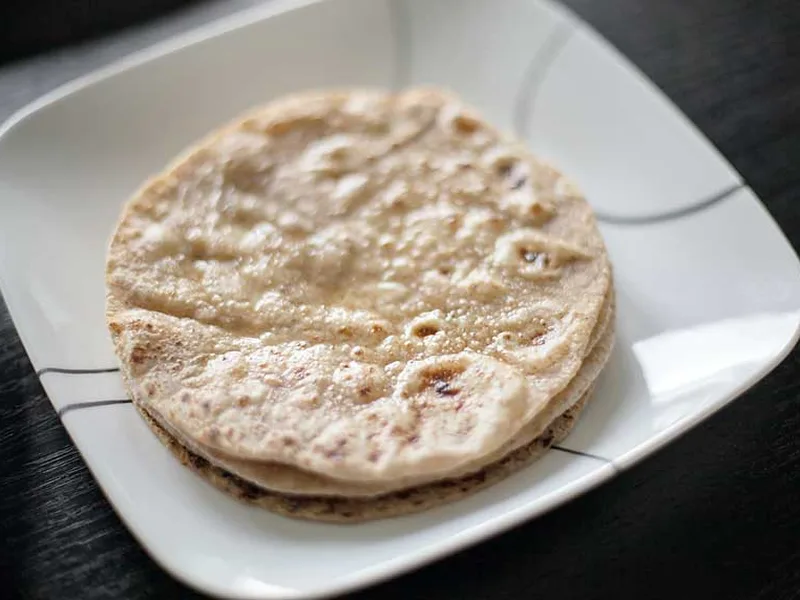 Traditional Indian flatbread made from whole wheat flour, olive oil, and water. Dough is kneaded, rested, portioned into balls, flattened, and rolled thin before cooking on a hot skillet until puffed with air pockets. Finished with butter for moisture and richness.