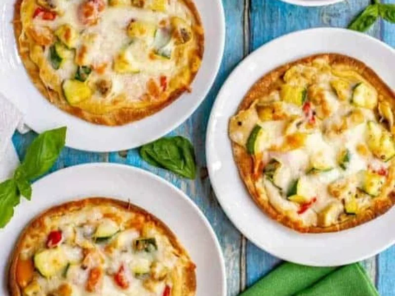 Whole wheat pitas spread with hummus and topped with sautéed zucchini, bell pepper, and mushrooms, then broiled with melted mozzarella. Quick vegetarian pizzas ready in under 20 minutes, served warm or cold.