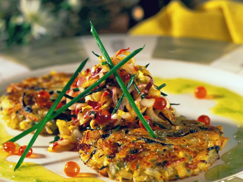 Elegant potato pancakes featuring hand-grated Idaho potatoes mixed with sweet crab meat, black chanterelles, and fresh herbs, pan-fried until golden and crispy. Topped with a sophisticated salad of chiffonade endive, smoked salmon caviar, and red onion, then finished with scallion-infused oil. Perfect for upscale brunch service or special occasion appetizers. The combination of earthy mushrooms, delicate crab, and briny caviar creates restaurant-quality flavor layers.