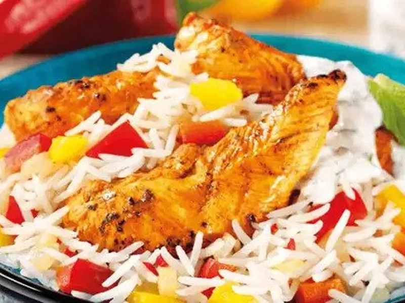 Quick one-pan Indian-spiced rice with pre-cooked tikka chicken, sautéed peppers, onion, and fresh chilli. Finished with cool yogurt and mint for contrast. Uses ready-to-eat steamed basmati rice for minimal cooking time.