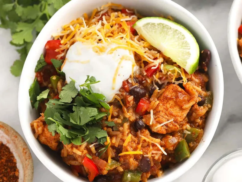 One-pot chicken and rice bowls loaded with peppers, black beans, and tomatoes, cooked entirely in the Instant Pot for weeknight convenience. Seasoned with taco spices and finished with fresh toppings like cilantro, lime, cheese, and Greek yogurt. Perfect for meal prep or quick dinners when you want burrito-bowl flavors without the assembly.