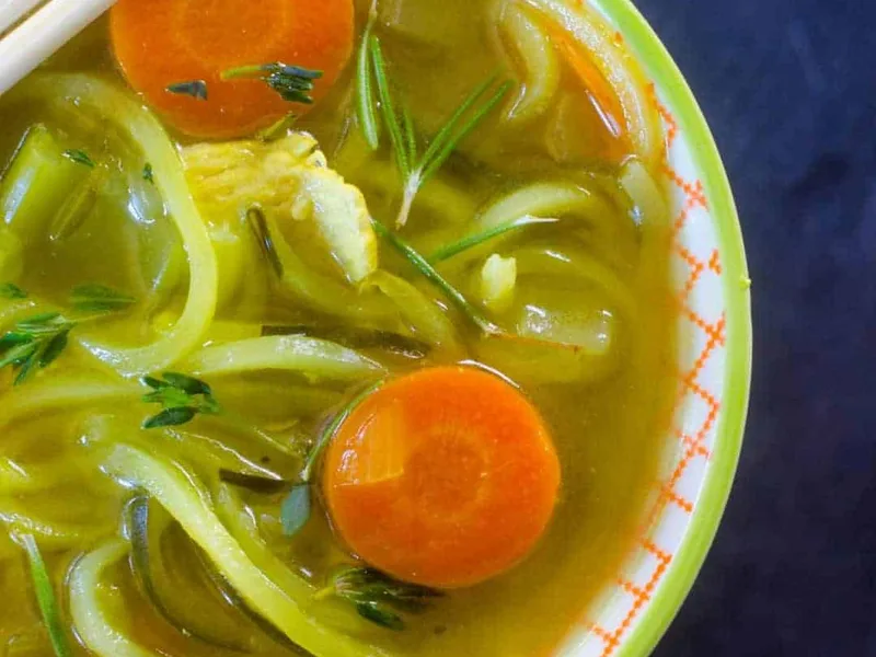 A bright, herb-infused chicken and vegetable soup built on sauteed aromatics and quick-cooked zucchini noodles. Turmeric adds earthiness and golden color while rosemary and thyme provide savory depth. The Instant Pot method locks in flavor in minutes, making this ideal for weeknight dinners or meal prep. This version prioritizes light, fresh zoodles over traditional pasta, keeping the soup lower-carb and vegetable-forward.