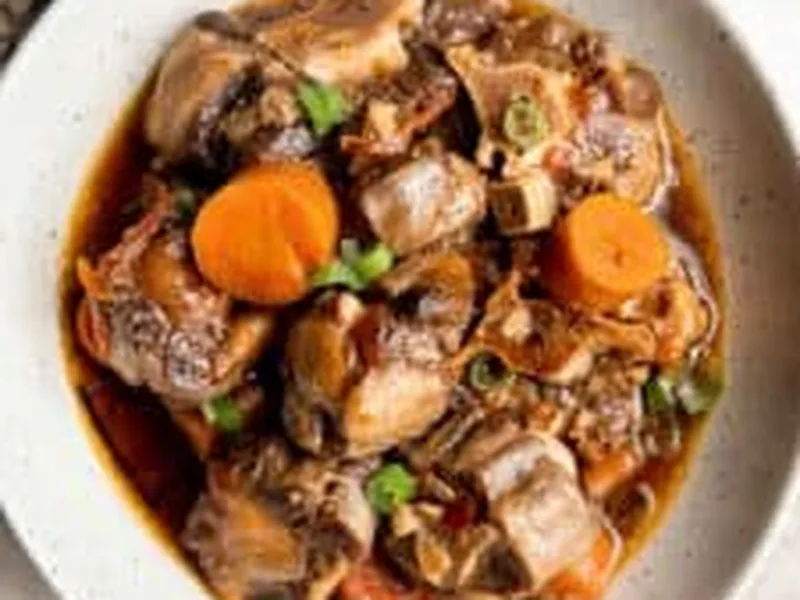 Tender braised beef oxtails infused with star anise, ginger, and Shaoxing wine in a rich soy-based broth. Pressure-cooked until the meat falls from the bone, then finished with fresh vegetables and aromatic garnish. A deeply flavored one-pot meal with Chinese-inspired spicing.