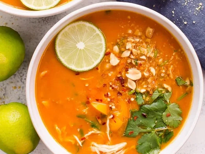 A vibrant one-pot Thai chicken soup combining tender shredded chicken, sweet potatoes, and creamy coconut milk with bold aromatics of fish sauce, red curry paste, and lime. The soup is enriched with chopped peanuts for texture and served bright with fresh cilantro and lime juice. This version bridges comfort food and Southeast Asian flavors using the Instant Pot for hands-off cooking in 30 minutes total. The pureed base creates silky depth while whole ingredients remain visible, balancing creaminess with substance. Perfect for weeknight dinners, meal prep, or when you want impressive homemade soup without extended stovetop time. The sweetness of maple syrup tempers the heat and saltiness, while optional kaffir lime leaves and bell peppers add complexity. Make this when you crave something warm, nourishing, and restaurant-quality at home.