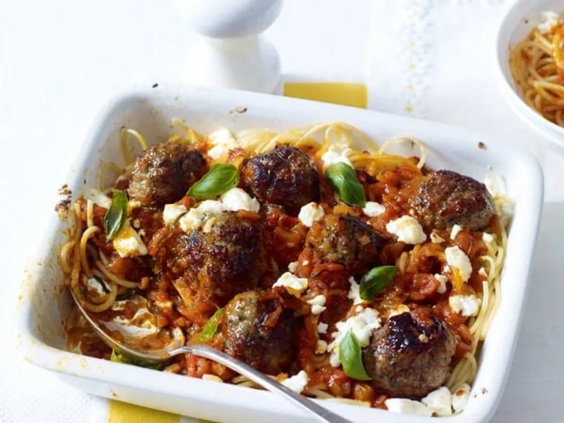 Herb-seasoned pork meatballs browned in olive oil with sauteed onion and tomato pasta sauce, tossed with spaghetti and finished under the grill with crumbled feta and fresh basil. Quick weeknight pasta with Italian flavors and a crispy cheese topping.