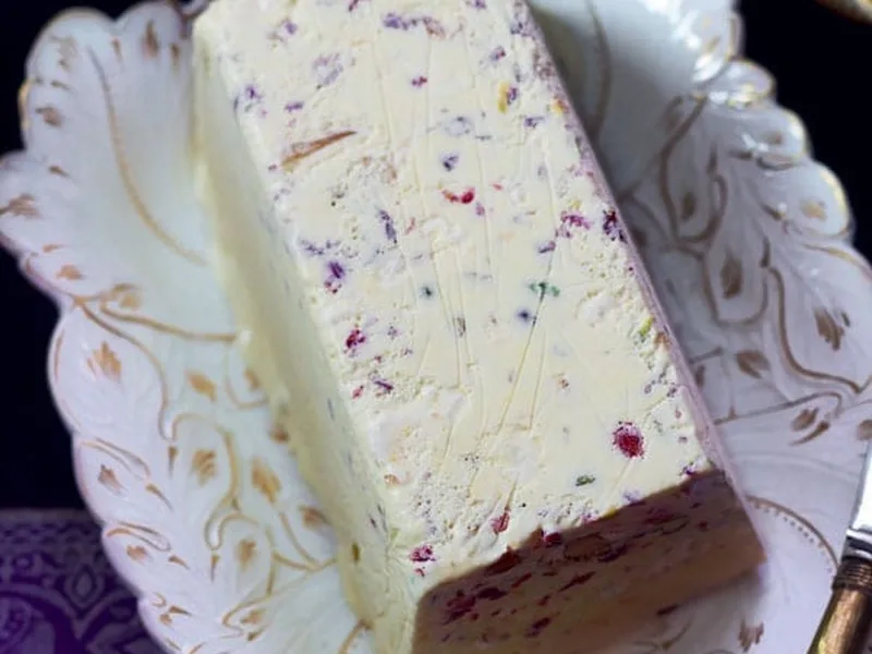 A luxurious frozen dessert combining zabaglione custard with smashed torrone candy, amaretto liqueur, orange zest, pistachios, and dried cranberries. Whipped egg whites and cream are folded through for a light, mousse-like texture. Make ahead and freeze until ready to serve.