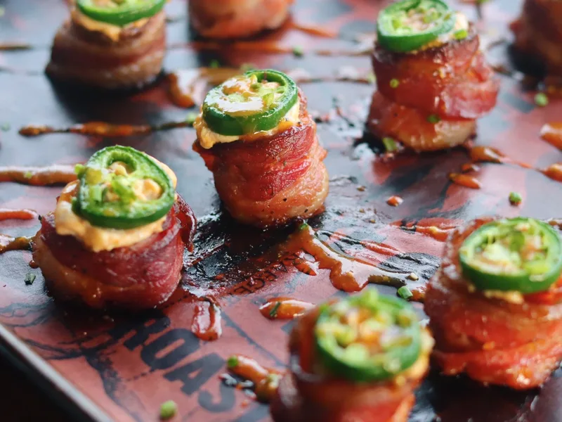 Crispy bacon-wrapped sausage cups filled with creamy pepper jack and cream cheese, topped with jalapeno slices and smoked until tender. A savory, spicy appetizer combining sweet heat seasoning, BBQ sauce, and smoky flavors from the grill.
