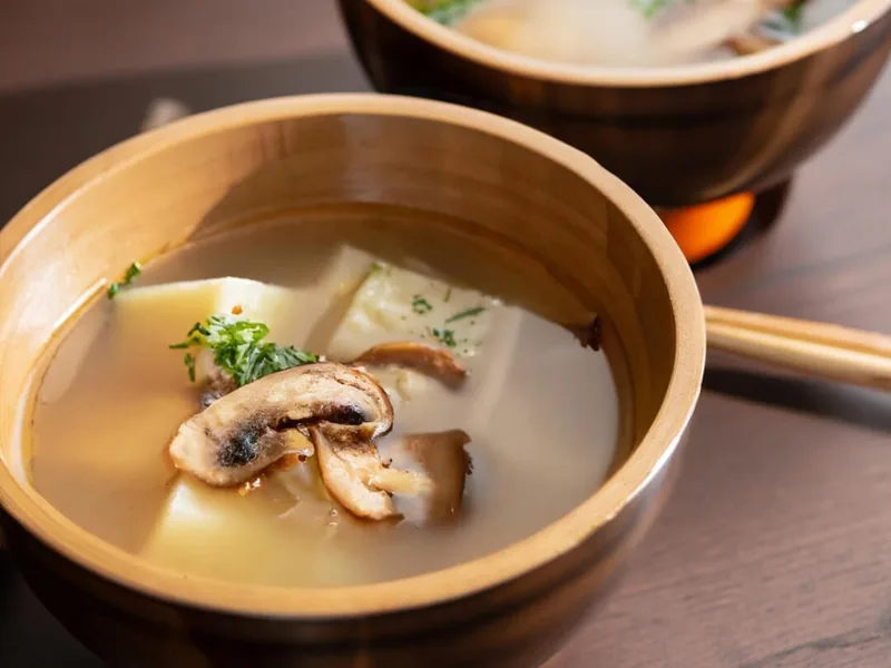 A quick, savory Japanese-inspired broth soup built on chicken stock simmered with fresh ginger and garlic, delivering warm umami depth. Tender cubed chicken breast, crisp snow peas, carrots, mushrooms, and green onions float in a clean, aromatic broth infused with soy sauce. What makes this version special is its speed—ready in under 25 minutes—and balance of delicate vegetables against a robust foundation. The ginger and garlic provide brightness without heaviness, while soy adds savory depth. Make this when you need comfort food fast: weeknight dinners, light lunches, or when someone needs warming up. Compared to heavy ramen or stew-like broths, this steakhouse-style soup keeps things refined and lean, leaning on technique and quality stock rather than long cooking.