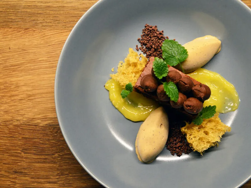 An intricate plated dessert combining coffee ice cream, lemon curd, walnut brownie, candied chocolate, pistachio mousse, and chocolate cream. Requires precision and advance planning across multiple components prepared over two days. Not recommended for beginners but achievable for experienced pastry cooks willing to master each element.