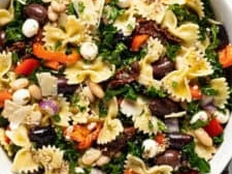 A vibrant, protein-packed pasta salad that combines tender massaged kale with al dente pasta, creamy mozzarella pearls, and briny olives in a homemade Italian dressing. This version stands out by starting with a kale massage to soften and brighten the greens, creating a more cohesive salad rather than a simple mix. Great Northern beans add fiber and plant-based protein, while roasted sun-dried tomatoes, banana peppers, and fresh parsley bring layered acidity and herbaceous notes. The textural contrast between tender pasta, crisp raw vegetables, and chewy olives makes each bite interesting. Perfect for meal prep, potlucks, or light weeknight dinners, this salad works as a side or substantial main when paired with grilled protein. Make it ahead and the flavors deepen as vegetables soften slightly and dressing coats everything evenly.