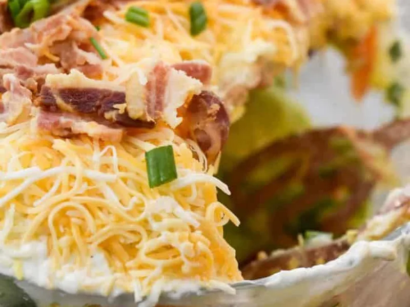 Gluten-free layered salad featuring crispy bacon, hard-boiled eggs, fresh vegetables, and a creamy mayo-sour cream dressing. Built in a trifle dish for visual appeal, this keto-friendly salad can be assembled ahead and refrigerated up to 36 hours before tossing and serving.