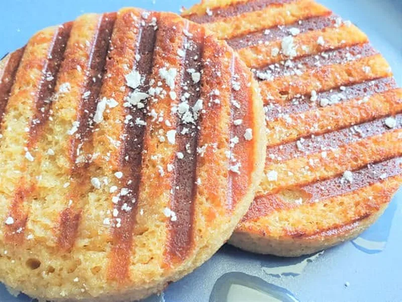 Quick keto-friendly French toast made in 90 seconds in the microwave, then pan-fried until golden. Uses coconut flour and psyllium husk for structure with monkfruit sweetener. Sliced and toasted in butter or grease for a crispy exterior. Top with sugar-free maple syrup and preferred toppings.