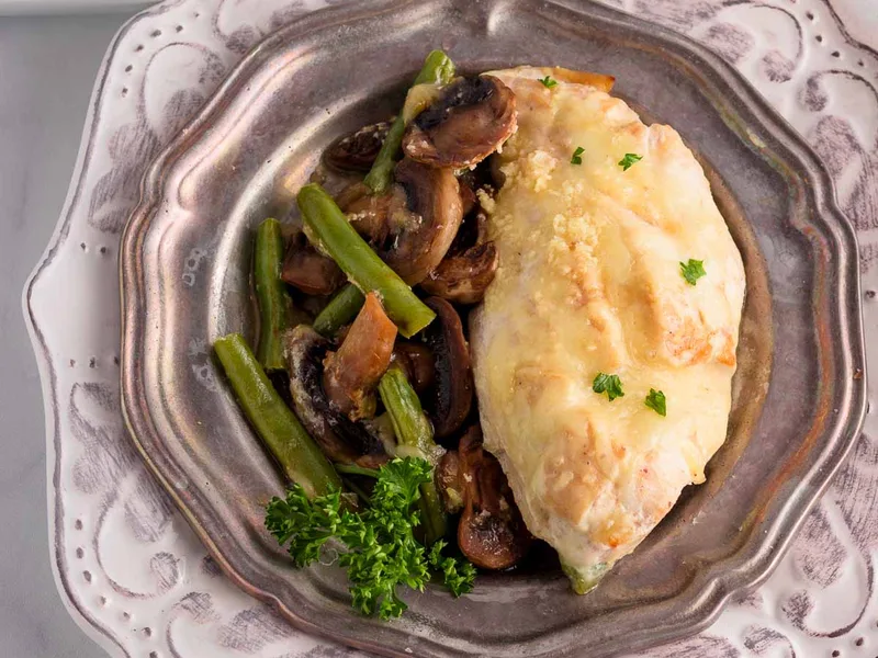 Boneless chicken breasts scored and marinated in a tangy sour cream sauce, then baked atop sautéed mushrooms and green beans, finished with melted mozzarella and parmesan. A low-carb, creamy casserole combining tender chicken with earthy vegetables and rich cheese topping.