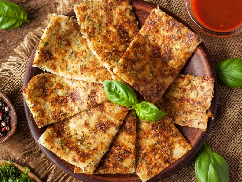 A low-carb cheese-based flatbread flavored with everything bagel seasoning. Mozzarella and cream cheese form a stretchy dough mixed with almond flour and egg, then baked until golden and crispy. The seasoning blend provides savory, garlicky, and onion notes typical of everything bagels without the carbs.