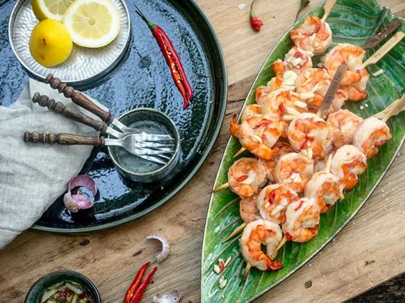 Charred king prawns marinated in minced garlic and sliced red chilli, grilled on skewers at high heat. A simple, bold preparation highlighting the sweetness of prawns against punchy garlic and heat, ready in under 3 hours including marinating time.