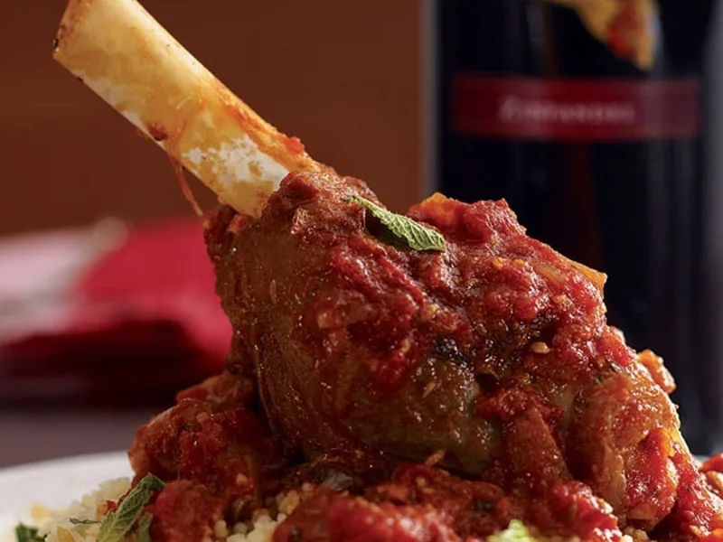 Slow-roasted lamb shanks infused with cumin, fennel, and rose harissa, braised in tomato and stock until fall-apart tender. Served alongside fluffy couscous studded with fresh mint, coriander, and preserved lemon. A North African-inspired one-pot meal requiring minimal active time.