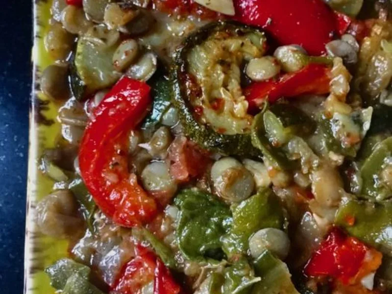 Kabakli Mercimekli Mualla is a Turkish-origin vegetable and legume casserole that showcases the simplicity of Mediterranean cooking. Layers of par-baked zucchini and red peppers alternate with a savory lentil mixture studded with Swiss chard, tomatoes, garlic, and mint. The dish balances earthy green lentils with sweet caramelized vegetables, finished with a light crispy top from final uncovered baking. Herbaceous dried mint ties the whole composition together, while room-temperature serving allows flavors to meld and mature. This vegetarian main works equally well as a substantial side to grilled proteins. It suits home cooks seeking honest, technique-driven cooking without pretense. Serve during cooler months when comfort food feels appropriate, or as a centerpiece at Mediterranean-themed gatherings. This version distinguishes itself through intentional par-baking of vegetables before assembly, a step that concentrates sweetness and prevents waterlogged results.