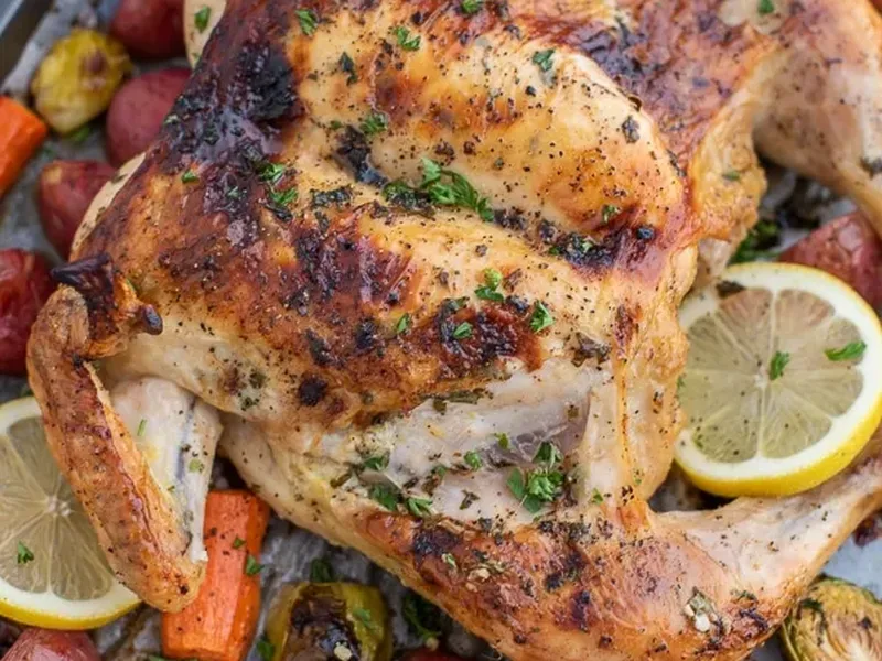 Whole chicken butterflied and flattened, rubbed with lemon garlic butter under and over the skin, roasted alongside carrots, brussels sprouts, and potatoes on a sheet pan. The butter mixture infuses the meat while vegetables caramelize, all cooking together in one pan for 40-45 minutes at 425°F.