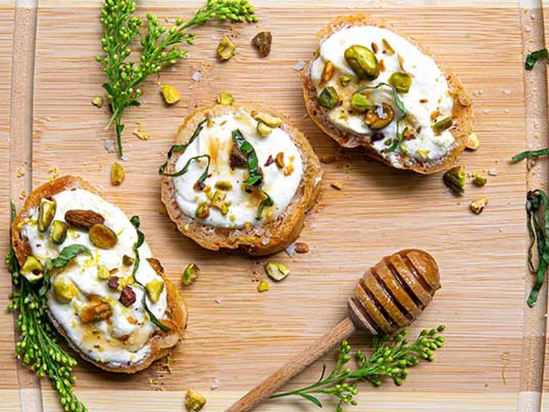Crispy toasted baguette rounds topped with creamy lemon-infused ricotta, drizzled with golden honey, and finished with crunchy pistachios and fresh basil. This Mediterranean-inspired appetizer balances bright citrus notes with rich cheese and aromatic herbs, making it perfect for spring gatherings or elegant dinner parties. The combination of textures from crispy bread to smooth ricotta and nutty pistachios creates a sophisticated bite that works equally well for brunch or evening entertaining.