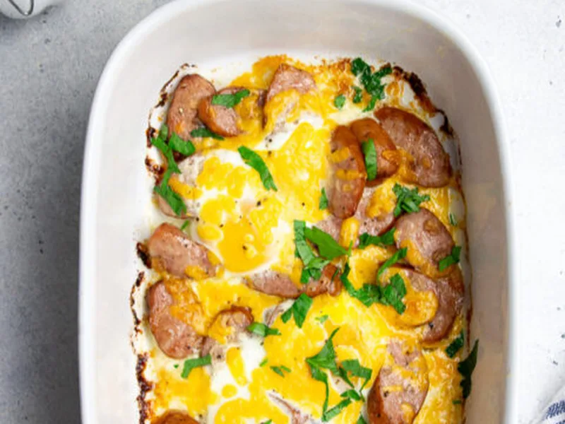 A quick, protein-packed breakfast bake that combines seasoned sausage, creamy eggs, and melted cheese in one dish. This low-carb meal delivers satisfying richness from the heavy cream and cheese while keeping carbohydrates minimal, making it ideal for keto or low-carb diets. The contrast between the savory sausage, tender egg whites, and runny yolks (if you prefer them that way) creates appealing texture and flavor. Best suited for anyone seeking a no-fuss morning protein boost or meal-prep friendly breakfast. Serve hot straight from the oven, paired with vegetables or greens for a complete meal. This version simplifies traditional baked egg dishes by incorporating pre-cooked sausage and minimal ingredients, reducing prep time while maintaining rich, satisfying flavors.