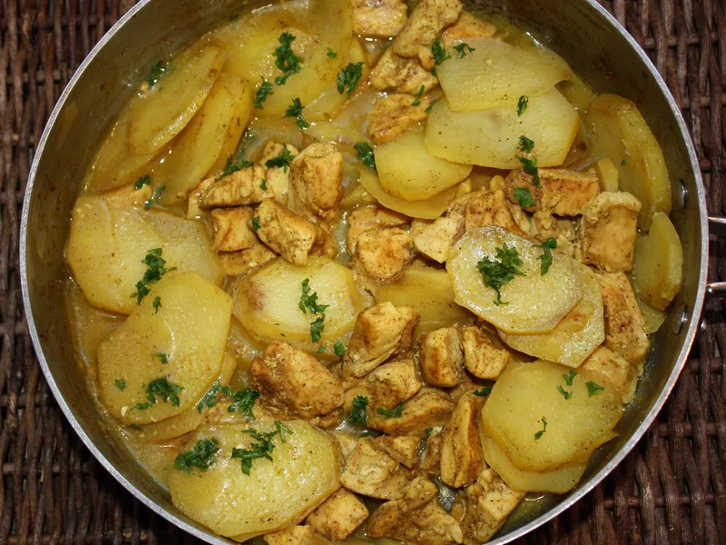 A gentle, aromatic chicken curry made without onion and garlic, suitable for low FODMAP diets. Boneless chicken breast and tender potatoes simmer in light coconut milk with curry powder, garam masala, cumin, and turmeric. Ready in under 20 minutes and serves six.
