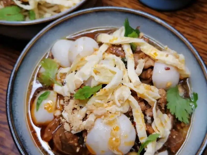 Assemble bowls by layering noodles, cooked fish balls, chicken topping, and broth. Top with egg ribbons, coriander leaves, and toasted ground peanuts.