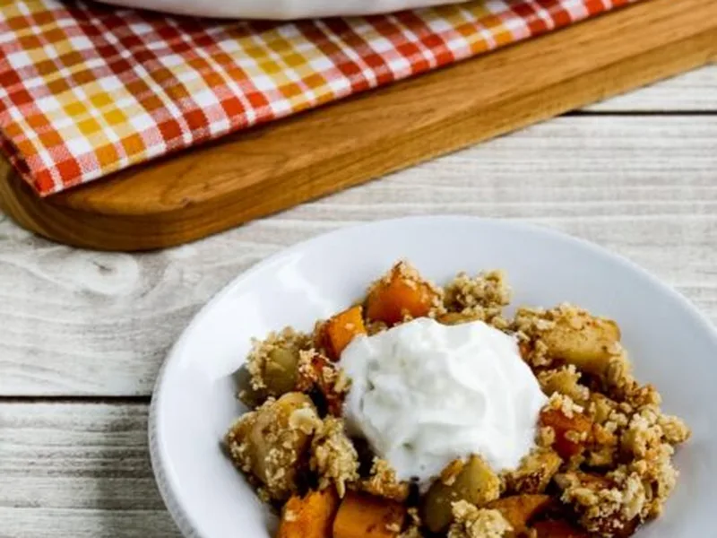 A satisfying autumn dessert that combines roasted butternut squash and fresh apples with a buttery oat-almond crumble topping, all without refined sugar. This version uses Golden Monkfruit Sweetener to keep carbs minimal while maintaining the warm spice flavors of fall. The filling becomes soft and jammy during cooking, creating contrast with the crispy, crumbly texture on top. The dish balances natural fruit sweetness with cinnamon and pumpkin pie spice for deep, cozy flavors. Perfect for those watching sugar intake or following low-carb diets, it's equally suited for regular eaters seeking a lighter dessert. Serve this warm on cool evenings, at holiday gatherings, or as a comforting weeknight treat. What sets this version apart is the technique of partly grinding oats and grating frozen butter directly into the crumble mixture, which creates an exceptionally tender, melt-in-mouth topping without excess moisture.