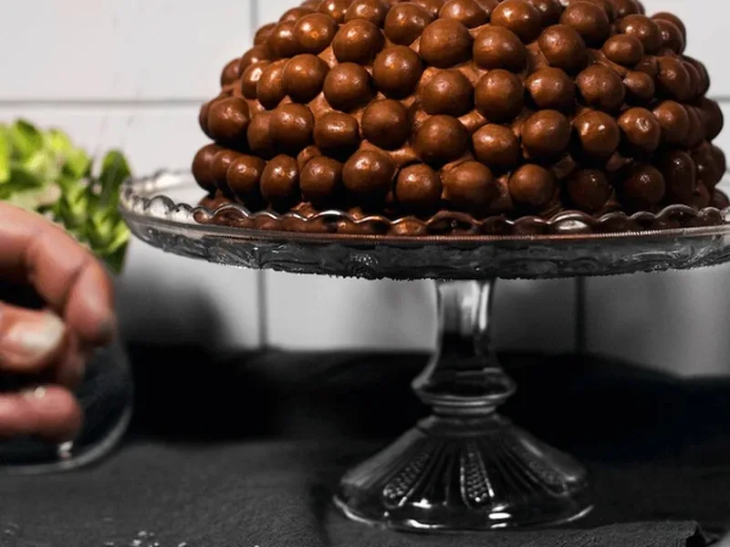 Three-layer chocolate cake with melted butter base, topped with lemon curd cream filling and fluffy chocolate frosting. Requires overnight chilling between assembly stages. Finished with ground chocolate or Malteser garnish for texture contrast.