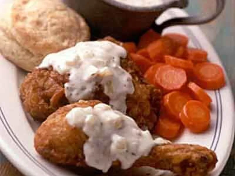 A simple stovetop gravy that transforms deli fried chicken into a homestyle meal. Caramelized onions meld with butter, cream, and broth to create a silky sauce with subtle thyme notes. Perfect for weeknight dinners when you want comfort food without the effort. This version uses store-bought chicken, making it accessible and quick.