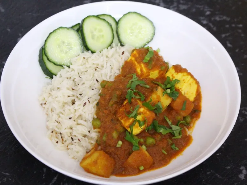 Fragrant Indian curry combining soft paneer cheese, peas, and potatoes in a tomato-based gravy. Onions, ginger, and garlic are ground into a paste and cooked with turmeric, Kashmiri chilli powder, and garam masala. Paneer and potatoes are fried separately before being folded into the finished curry with fresh coriander.