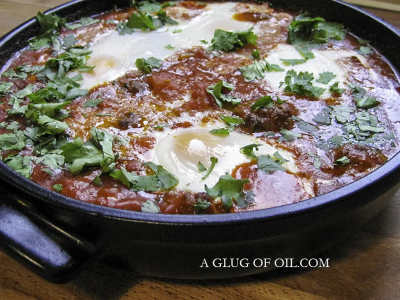 Spiced beef meatballs braised in a concentrated tomato sauce with honey, finished with baked eggs. A North African one-pot dish combining aromatic cumin and paprika with fresh herbs, served with flatbread.