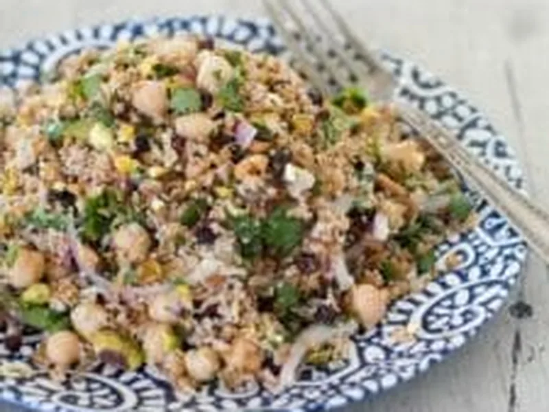 A vibrant Mediterranean-inspired grain salad combining nutty bulgur wheat with protein-rich chickpeas, fresh herbs, and sweet currants. The bright lemon dressing and crunchy pistachios create a satisfying contrast of textures and flavors. Perfect as a light lunch, side dish for grilled meats, or potluck contribution. This version stands out for its generous use of fresh cilantro and parsley, plus the option to add cooling Greek yogurt. The salad improves as it sits, making it ideal for meal prep.