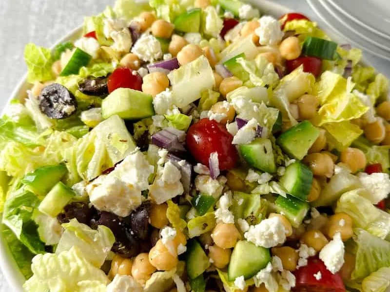 Crisp romaine, cherry tomatoes, and cucumber tossed with chickpeas, red onion, and Kalamata olives. Red wine vinegar and oregano dressing brightens the fresh vegetables. Crumbled feta cheese added at serving time keeps it from becoming soggy. Quick to assemble, perfect for meal prep.