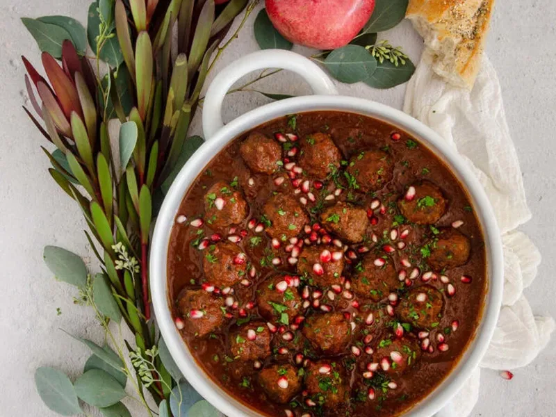 Tender spiced lamb meatballs simmered in a rich tomato sauce brightened with pomegranate juice and honey. The aromatic blend of cinnamon, cumin, fresh mint and parsley gives these meatballs a distinctly Middle Eastern flavor profile. Perfect for serving over rice, with flatbread, or as part of a mezze spread. The pomegranate juice adds a subtle tartness that balances the richness of the lamb, while the long simmer creates deeply melded flavors and fork-tender meatballs.