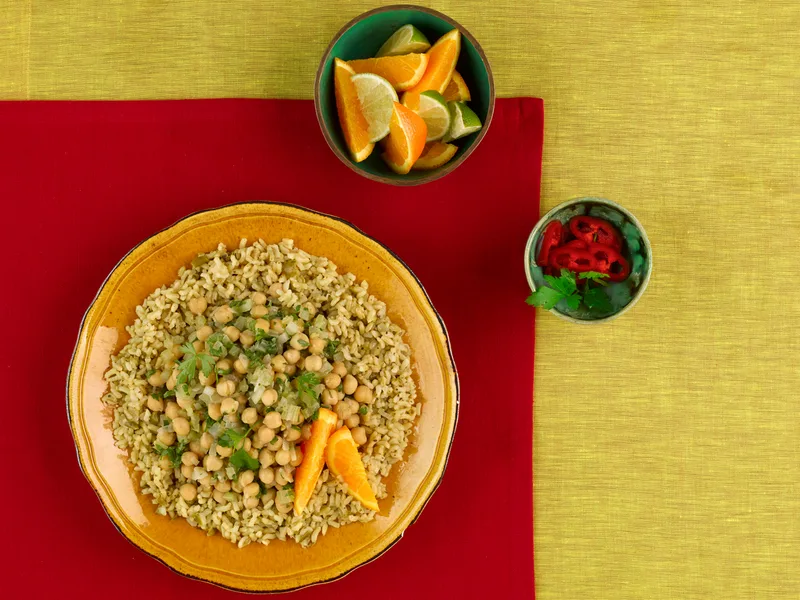 Cook rice and chickpea mixture simultaneously to serve warm and meld flavors effectively.