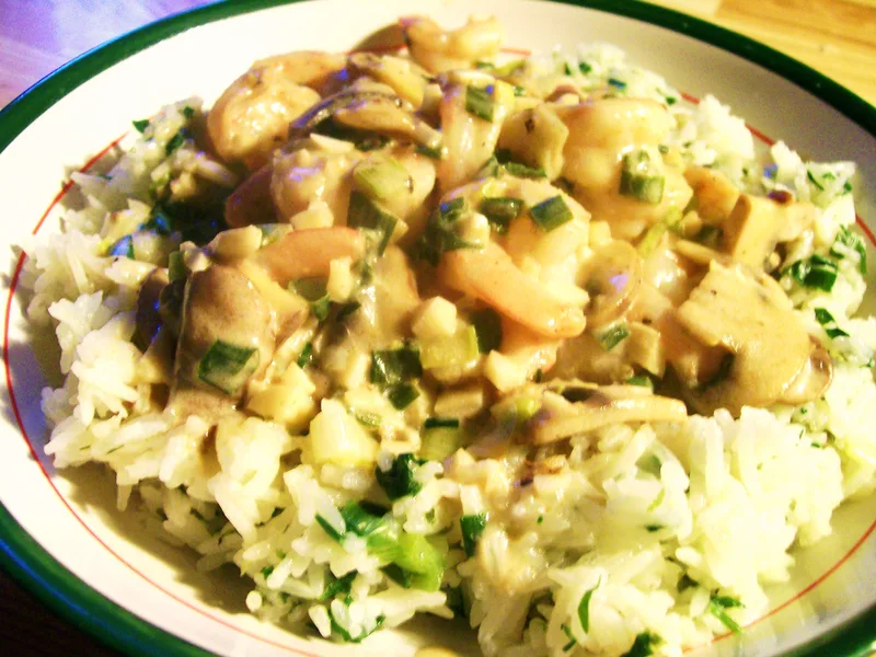 A creamy, comforting curry featuring tender shrimp in a rich sour cream sauce with mushrooms, green peppers, and aromatic curry spices. This quick microwave version delivers authentic curry flavors without the lengthy stovetop preparation. Perfect for busy weeknights when you want something satisfying and flavorful. The toasted almonds add a delightful crunch that contrasts beautifully with the creamy sauce, while the combination of Worcestershire sauce and dry mustard gives the dish its distinctive depth.