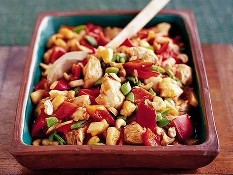 Quick microwave sweet and sour chicken with pineapple, peppers, and cashews. Chicken chunks cook in a tangy ketchup and vinegar sauce with muscovado sugar, garlic, and fresh vegetables. Ready in under 20 minutes.
