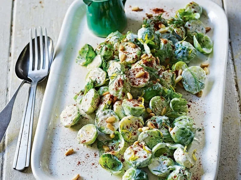 A vibrant, protein-packed salad that transforms humble brussels sprouts into something unexpectedly craveable. Bright green sprouts are blanched until just tender, then tossed with a tangy, herb-forward yogurt dressing infused with lemon, garlic, and mustard. Pine nuts add crunch and richness, while baharat—a warm, earthy spice blend—brings authentic Middle Eastern character. The yogurt base keeps the dish light yet satisfying, making it ideal for meal prep or as a side for grilled meats and fish. What sets this version apart is the balance of crisp vegetable texture against creamy dressing, plus the aromatic spice layer that enhances standard salad conventions. Perfect for weeknight dinners or entertaining, it works equally well warm or at room temperature.