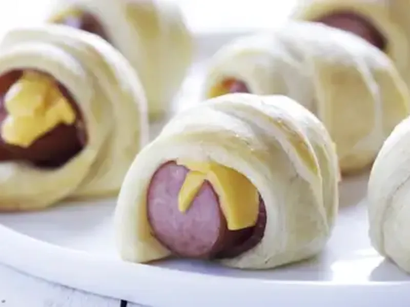 These party-perfect appetizers combine savory hot dogs stuffed with melted American cheese, wrapped in crispy bacon, and encased in golden Pillsbury crescent roll dough. Each bite delivers a satisfying combination of smoky bacon, creamy cheese, and flaky pastry that makes them ideal for game day gatherings, potlucks, or casual entertaining. The mini size creates perfect finger food portions while the triple-layer wrapping ensures maximum flavor in every bite.