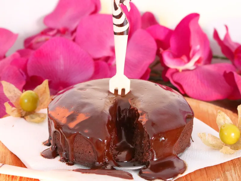 Pierce the cake thoroughly before pouring the ganache to allow it to flow into the center and create the volcano effect.