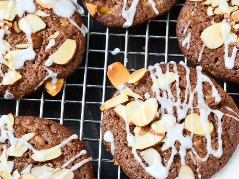 Buttery chocolate cookies infused with instant espresso and studded with toffee brickle chips and sliced almonds. Finished with a powdered sugar glaze, these mocha-flavored treats deliver rich coffee notes and satisfying crunch in every bite.