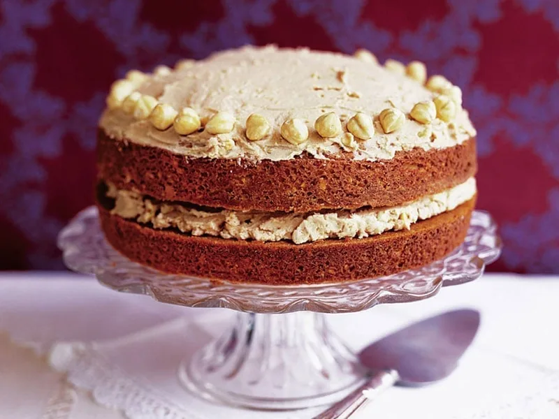 A sophisticated two-layer sponge cake that combines the warmth of roasted hazelnuts with subtle coffee notes, crowned with a silky cocoa and hazelnut buttercream. What sets this version apart is the toasted hazelnuts folded directly into the batter, delivering nutty texture throughout rather than just as garnish. The coffee is understated—just enough to deepen the chocolate notes without overpowering. Light, airy sponges built on proper creaming technique contrast beautifully against rich frosting. This cake suits afternoon tea, celebration desserts, or anyone craving coffee-and-chocolate comfort with grown-up sophistication. The roasting step is crucial: it transforms raw hazelnuts into deeply flavored, aromatic elements that define the cake's character. Serve at room temperature for best flavor and texture.