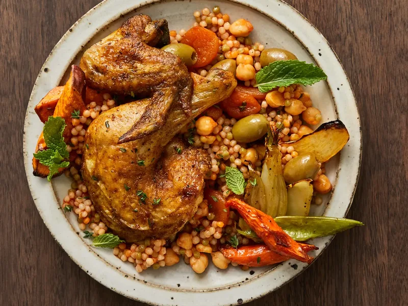 Whole chicken rubbed with ras el hanout and roasted over a bed of root vegetables, served with pearl couscous tossed in a chickpea and olive stew featuring dried apricots, fresh herbs, and pan juices. Tender, aromatic, and complete in one meal.