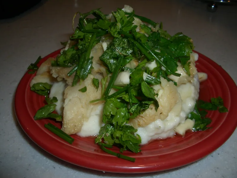 Salt Cod and Mashed Potatoes with Garlic Parsley Oil