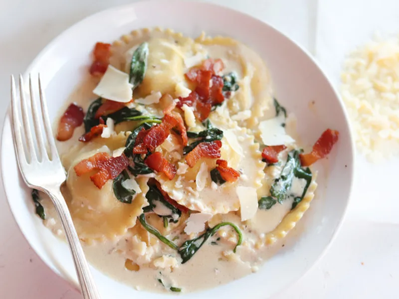 Plate ravioli and spoon sauce over, ensuring each portion gets bacon, spinach, and cream. Garnish with fresh parmesan and cracked black pepper. Pair with crisp white wine like Pinot Grigio or Sauvignon Blanc.
