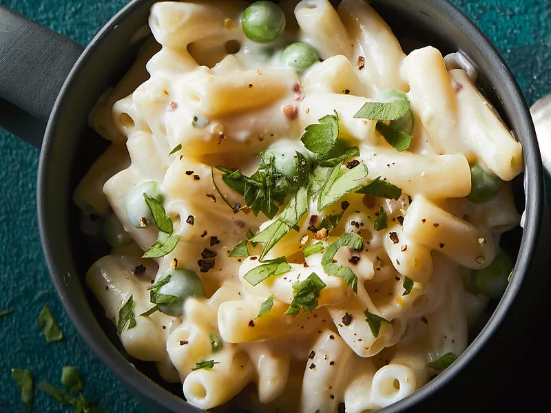 Single-serve macaroni and cheese cooked entirely in a microwave mug. Creamy Somerset Cheddar and wholegrain mustard create a tangy, savory sauce that cooks with the pasta. Frozen peas add freshness. Ready in about 10 minutes with minimal cleanup.