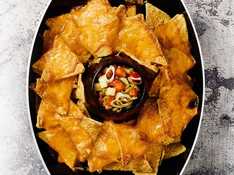 Tortilla chips topped with melted cheddar cheese and served alongside a fresh salsa made from tomatoes, spring onion, apple, lime, red onion, garlic, and ginger, sweetened with honey and brown sugar. Cooked indirectly on the barbecue until the cheese melts and the salsa simmers, taking about 15 minutes.