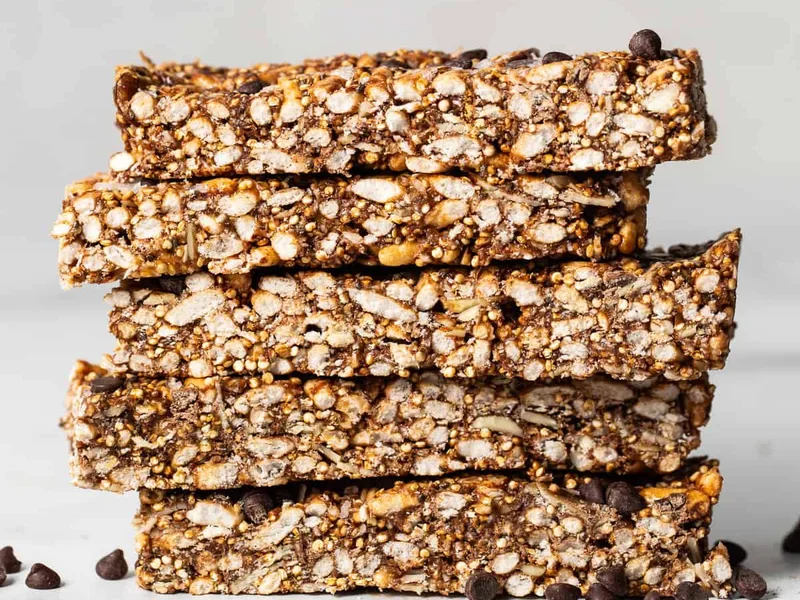 Crispy, chewy bars built on a foundation of toasted quinoa and puffed brown rice, bound together with warm brown rice syrup and honey sweetened with creamy cashew butter. Almonds, unsweetened coconut, and chia seeds add texture and nutrition, while melted chocolate chips provide pockets of richness. This no-bake treat is perfect for lunchboxes, afternoon snacks, or a lighter dessert that requires minimal kitchen skills. The combination of whole grains and nuts delivers sustained energy, making it ideal for active families or anyone seeking a wholesome alternative to processed granola bars.